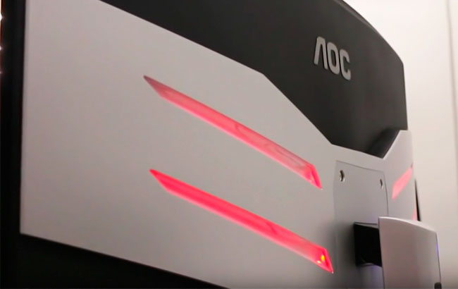 Outra função que pode atrair os jogadores é que a parte traseira do monitor preto com base metálica possui 4 faixas de LED configuráveis com três cores diferentes (vermelho, azul e verde), deixando o efeito "neon" na parede do seu quarto.